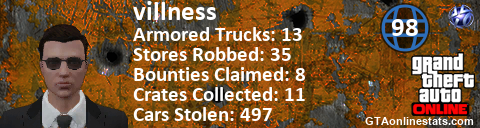 [URL=http://GTAonlinestats.com/showplayer/villness][IMG]http://GTAonlinestats.com/crimesignature/villness/sig.png[/IMG][/URL]