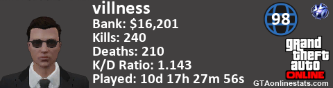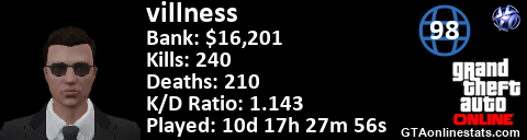 [URL=http://GTAonlinestats.com/showplayer/villness][IMG]http://GTAonlinestats.com/signature/villness/sig.png[/IMG][/URL]