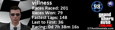 [URL=http://GTAonlinestats.com/showplayer/villness][IMG]http://GTAonlinestats.com/racesignature/villness/sig.png[/IMG][/URL]