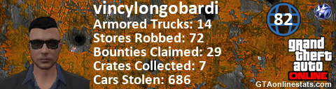 [URL=http://GTAonlinestats.com/showplayer/vincylongobardi][IMG]http://GTAonlinestats.com/crimesignature/vincylongobardi/sig.png[/IMG][/URL]
