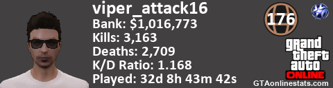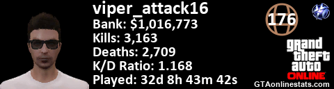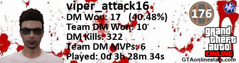 <a href="http://GTAonlinestats.com/showplayer/viper_attack16"><img src="http://GTAonlinestats.com/dmsignature/viper_attack16/sig.png" alt="viper_attack16" border="0" /></a>