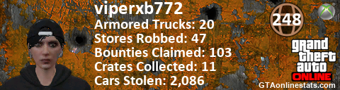 [URL=http://GTAonlinestats.com/showplayer/viperxb772][IMG]http://GTAonlinestats.com/randomsignature/viperxb772/sig.png[/IMG][/URL]