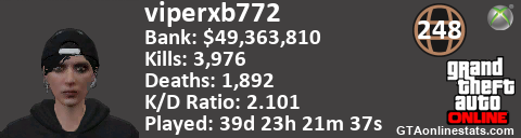[URL=http://GTAonlinestats.com/showplayer/viperxb772][IMG]http://GTAonlinestats.com/signature/viperxb772/sig.png[/IMG][/URL]