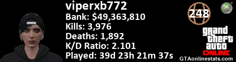 <a href="http://GTAonlinestats.com/showplayer/viperxb772"><img src="http://GTAonlinestats.com/dmsignature/viperxb772/sig.png" alt="viperxb772" border="0" /></a>