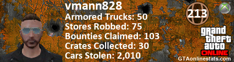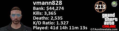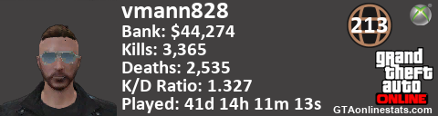 <a href="http://GTAonlinestats.com/showplayer/vmann828"><img src="http://GTAonlinestats.com/randomsignature/vmann828/sig.png" alt="vmann828" border="0" /></a>
