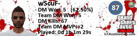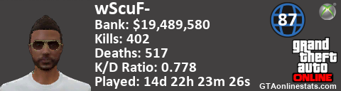 [URL=http://GTAonlinestats.com/showplayer/wScuF-][IMG]http://GTAonlinestats.com/dmsignature/wScuF-/sig.png[/IMG][/URL]