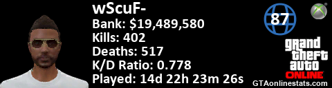 [URL=http://GTAonlinestats.com/showplayer/wScuF-][IMG]http://GTAonlinestats.com/randomsignature/wScuF-/sig.png[/IMG][/URL]