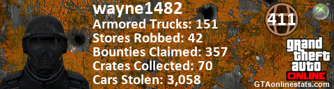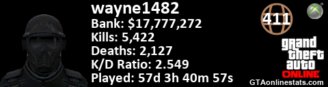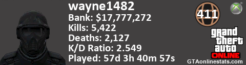 <a href="http://GTAonlinestats.com/showplayer/wayne1482"><img src="http://GTAonlinestats.com/randomsignature/wayne1482/sig.png" alt="wayne1482" border="0" /></a>