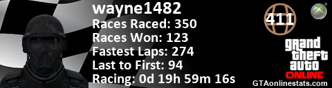 <a href="http://GTAonlinestats.com/showplayer/wayne1482"><img src="http://GTAonlinestats.com/racesignature/wayne1482/sig.png" alt="wayne1482" border="0" /></a>