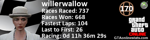 [URL=http://GTAonlinestats.com/showplayer/willerwallow/2][IMG]http://GTAonlinestats.com/racesignature/willerwallow/2/sig.png[/IMG][/URL]