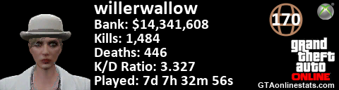 [URL=http://GTAonlinestats.com/showplayer/willerwallow/2][IMG]http://GTAonlinestats.com/signature/willerwallow/2/sig.png[/IMG][/URL]