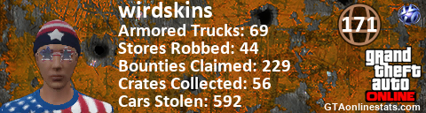 <a href="http://GTAonlinestats.com/showplayer/wirdskins"><img src="http://GTAonlinestats.com/randomsignature/wirdskins/sig.png" alt="wirdskins" border="0" /></a>