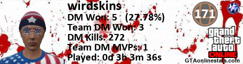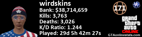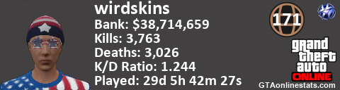 <a href="http://GTAonlinestats.com/showplayer/wirdskins"><img src="http://GTAonlinestats.com/dmsignature/wirdskins/sig.png" alt="wirdskins" border="0" /></a>