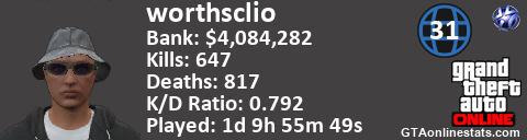 <a href="http://GTAonlinestats.com/showplayer/worthsclio/2"><img src="http://GTAonlinestats.com/greysignature/worthsclio/2/sig.png" alt="worthsclio" border="0" /></a>