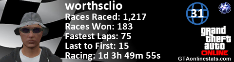 [URL=http://GTAonlinestats.com/showplayer/worthsclio/2][IMG]http://GTAonlinestats.com/racesignature/worthsclio/2/sig.png[/IMG][/URL]
