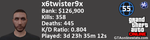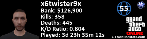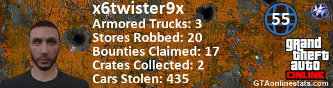 <a href="http://GTAonlinestats.com/showplayer/x6twister9x"><img src="http://GTAonlinestats.com/signature/x6twister9x/sig.png" alt="x6twister9x" border="0" /></a>