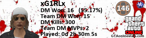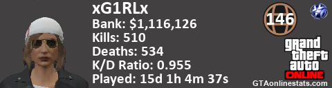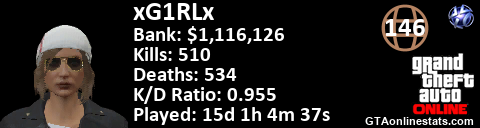 <a href="http://GTAonlinestats.com/showplayer/xG1RLx"><img src="http://GTAonlinestats.com/dmsignature/xG1RLx/sig.png" alt="xG1RLx" border="0" /></a>