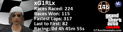<a href="http://GTAonlinestats.com/showplayer/xG1RLx"><img src="http://GTAonlinestats.com/racesignature/xG1RLx/sig.png" alt="xG1RLx" border="0" /></a>