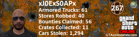 <a href="http://GTAonlinestats.com/showplayer/xJ0ExS0APx"><img src="http://GTAonlinestats.com/signature/xJ0ExS0APx/sig.png" alt="xJ0ExS0APx" border="0" /></a>