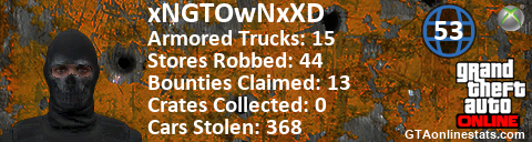 [URL=http://GTAonlinestats.com/showplayer/xNGTOwNxXD][IMG]http://GTAonlinestats.com/crimesignature/xNGTOwNxXD/sig.png[/IMG][/URL]