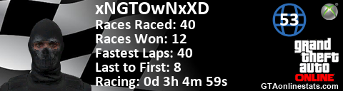 [URL=http://GTAonlinestats.com/showplayer/xNGTOwNxXD][IMG]http://GTAonlinestats.com/racesignature/xNGTOwNxXD/sig.png[/IMG][/URL]