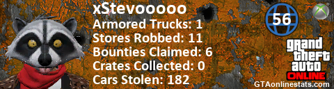 [URL=http://GTAonlinestats.com/showplayer/xStevooooo][IMG]http://GTAonlinestats.com/crimesignature/xStevooooo/sig.png[/IMG][/URL]