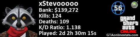 [URL=http://GTAonlinestats.com/showplayer/xStevooooo][IMG]http://GTAonlinestats.com/signature/xStevooooo/sig.png[/IMG][/URL]