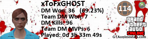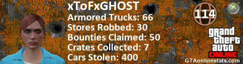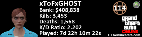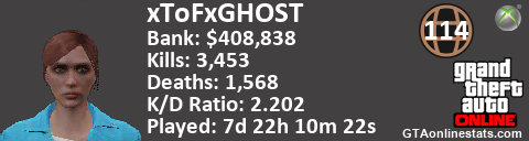 [URL=http://GTAonlinestats.com/showplayer/xToFxGHOST][IMG]http://GTAonlinestats.com/randomsignature/xToFxGHOST/sig.png[/IMG][/URL]