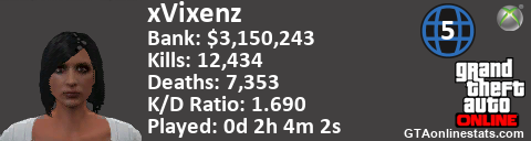 [URL=http://GTAonlinestats.com/showplayer/xVixenz/3][IMG]http://GTAonlinestats.com/signature/xVixenz/3/sig.png[/IMG][/URL]