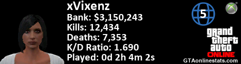 <a href="http://GTAonlinestats.com/showplayer/xVixenz/3"><img src="http://GTAonlinestats.com/signature/xVixenz/3/sig.png" alt="xVixenz" border="0" /></a>