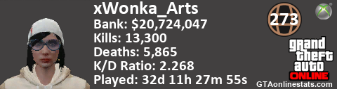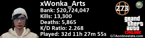 <a href="http://GTAonlinestats.com/showplayer/xWonka_Arts"><img src="http://GTAonlinestats.com/signature/xWonka_Arts/sig.png" alt="xWonka_Arts" border="0" /></a>
