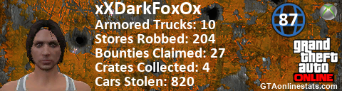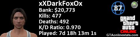 [URL=http://GTAonlinestats.com/showplayer/xXDarkFoxOx][IMG]http://GTAonlinestats.com/dmsignature/xXDarkFoxOx/sig.png[/IMG][/URL]