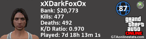 [URL=http://GTAonlinestats.com/showplayer/xXDarkFoxOx][IMG]http://GTAonlinestats.com/greysignature/xXDarkFoxOx/sig.png[/IMG][/URL]