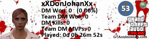 [URL=http://GTAonlinestats.com/showplayer/xXDonJohanXx][IMG]http://GTAonlinestats.com/randomsignature/xXDonJohanXx/sig.png[/IMG][/URL]