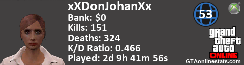 [URL=http://GTAonlinestats.com/showplayer/xXDonJohanXx][IMG]http://GTAonlinestats.com/dmsignature/xXDonJohanXx/sig.png[/IMG][/URL]