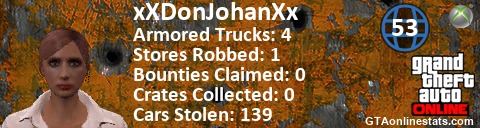 [URL=http://GTAonlinestats.com/showplayer/xXDonJohanXx][IMG]http://GTAonlinestats.com/crimesignature/xXDonJohanXx/sig.png[/IMG][/URL]