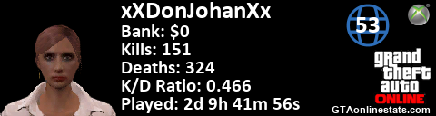 [URL=http://GTAonlinestats.com/showplayer/xXDonJohanXx][IMG]http://GTAonlinestats.com/signature/xXDonJohanXx/sig.png[/IMG][/URL]