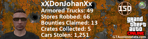 [URL=http://GTAonlinestats.com/showplayer/xXDonJohanXx/2][IMG]http://GTAonlinestats.com/crimesignature/xXDonJohanXx/2/sig.png[/IMG][/URL]