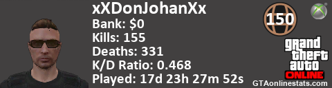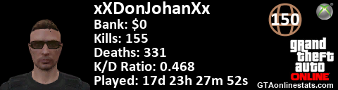 <a href="http://GTAonlinestats.com/showplayer/xXDonJohanXx/2"><img src="http://GTAonlinestats.com/signature/xXDonJohanXx/2/sig.png" alt="xXDonJohanXx" border="0" /></a>