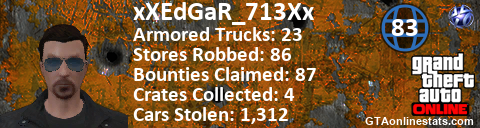 [URL=http://GTAonlinestats.com/showplayer/xXEdGaR_713Xx][IMG]http://GTAonlinestats.com/crimesignature/xXEdGaR_713Xx/sig.png[/IMG][/URL]