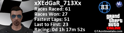 [URL=http://GTAonlinestats.com/showplayer/xXEdGaR_713Xx][IMG]http://GTAonlinestats.com/racesignature/xXEdGaR_713Xx/sig.png[/IMG][/URL]