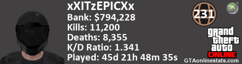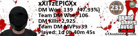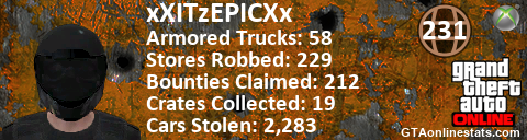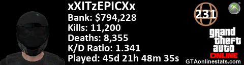 [URL=http://GTAonlinestats.com/showplayer/xXITzEPICXx][IMG]http://GTAonlinestats.com/dmsignature/xXITzEPICXx/sig.png[/IMG][/URL]