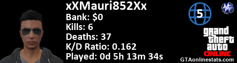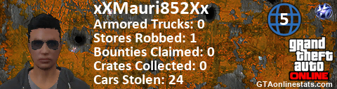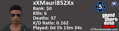[URL=http://GTAonlinestats.com/showplayer/xXMauri852Xx][IMG]http://GTAonlinestats.com/randomsignature/xXMauri852Xx/sig.png[/IMG][/URL]