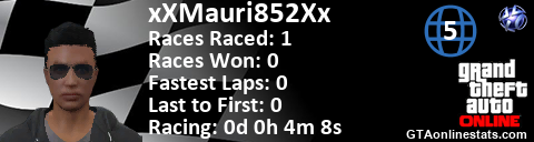 [URL=http://GTAonlinestats.com/showplayer/xXMauri852Xx][IMG]http://GTAonlinestats.com/racesignature/xXMauri852Xx/sig.png[/IMG][/URL]