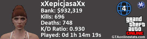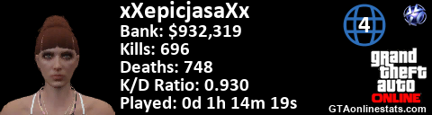 [URL=http://GTAonlinestats.com/showplayer/xXepicjasaXx/2][IMG]http://GTAonlinestats.com/signature/xXepicjasaXx/2/sig.png[/IMG][/URL]
