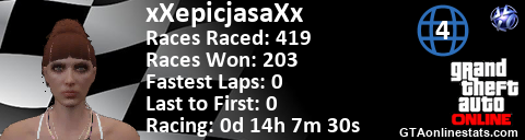 [URL=http://GTAonlinestats.com/showplayer/xXepicjasaXx/2][IMG]http://GTAonlinestats.com/racesignature/xXepicjasaXx/2/sig.png[/IMG][/URL]