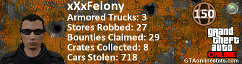[URL=http://GTAonlinestats.com/showplayer/xXxFelony/2][IMG]http://GTAonlinestats.com/crimesignature/xXxFelony/2/sig.png[/IMG][/URL]