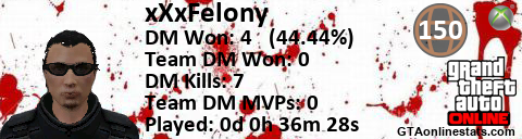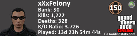 [URL=http://GTAonlinestats.com/showplayer/xXxFelony/2][IMG]http://GTAonlinestats.com/dmsignature/xXxFelony/2/sig.png[/IMG][/URL]