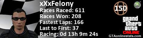 [URL=http://GTAonlinestats.com/showplayer/xXxFelony/2][IMG]http://GTAonlinestats.com/racesignature/xXxFelony/2/sig.png[/IMG][/URL]