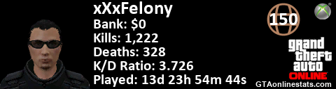 [URL=http://GTAonlinestats.com/showplayer/xXxFelony/2][IMG]http://GTAonlinestats.com/randomsignature/xXxFelony/2/sig.png[/IMG][/URL]